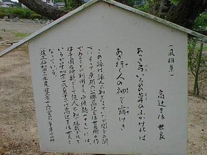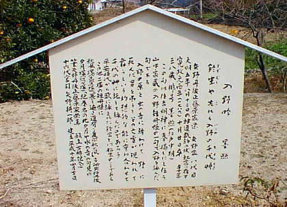 | 入 野 吟 風雅集 「あつさ弓いるのの草のふかけれはあさ行く人の袖ぞ露けき 高辻 三位 世良」 土居神社神苑「すゝきが原」と「入野吟歌碑」星田真次揮毫 昭和四十六年梅園に建立 |