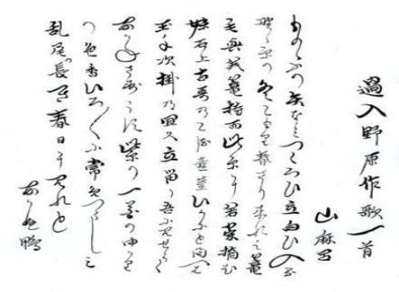 一茶が山中家に遺した懐紙の長歌の題「過入野原作歌一首」は、山部赤人の「野」(二七二番)の「山部宿祢赤人登春日野作歌一首併短歌」が下敷きになっている。山部赤人は、道後に歌を遺すなど伊予には関係が深いが、この懐紙には赤人の歌を下敷きに用いているものが多い。