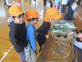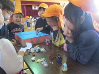 どんぐりやまつぼっくりを使って色々なものが出来ていて、子ども達も「すごい!」と興味津々。
