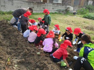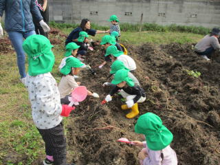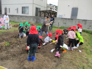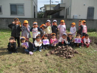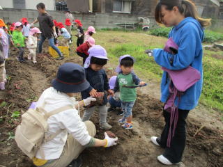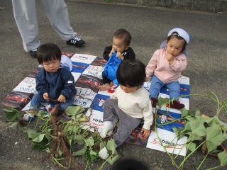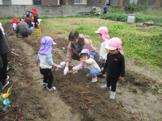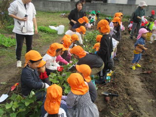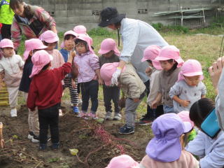 R7.11.5 今日は、待ちに待った芋ほり! 幼児はもちろん、乳児クラスもちょっぴり参加し、みんなで掘ってきました! 乳児はおそるおそる… 2歳児は見えているお芋に大興奮♪ 幼児は、随分と手慣れたもので、次から次へとスコップで掘っては、おいもが見えると傷つけないように 丁寧に掘り出して、大きさ比べをして楽しんでいましたよ♪ 来週は、焼き芋パーティーをしたいと思います☆