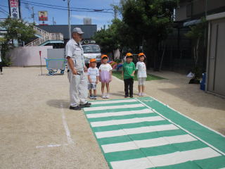 だいちゃんと、交通ルールや信号機のお約束をした後には、園庭の模擬道路で、実際に歩き方も学びました。