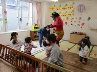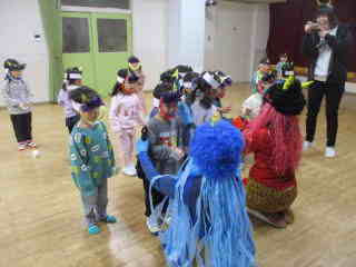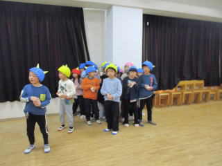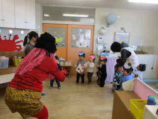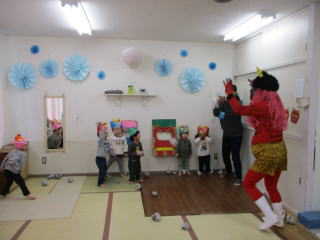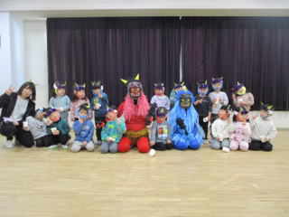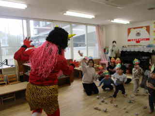 R8.2.3 1月下旬ごろから「鬼くるかな・・・?」とそわそわしていた子ども達。 とうとう、この日がやってきました! 小さいお友達は、事前に鬼の的当てで、豆(新聞紙で代用)を投げる練習もバッチリ!だったものの… 鬼の登場に涙が出た子、上手に隠れた子、必死に豆を投げようとする子・・・と様々な様子。 また、幼児クラスは「まめまき」の歌を歌い「でてこーい!」と意気込み十分! 逃げながらも勇ましく豆を投げたり、鬼につかまった先生を助けたりしながら、 鬼退治をしていましたよ☆ 古くから伝わる風習も大切にしていきたいですね。 |