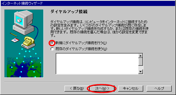 「新規にダイヤルアップ接続を行う(C)」にチェックをして「次へ」のボタンをクリックします。